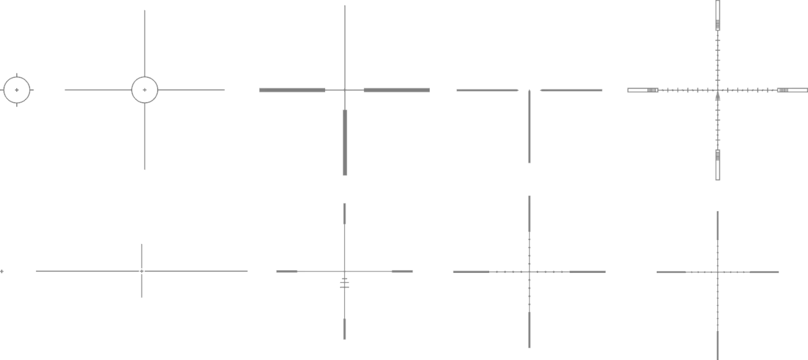 Širok nabor barvno prilagodljivih namerilnih križev, vključno s prilagodljivimi balističnimi slogi. Barvne možnosti: črna, bela, rdeča in zelena.